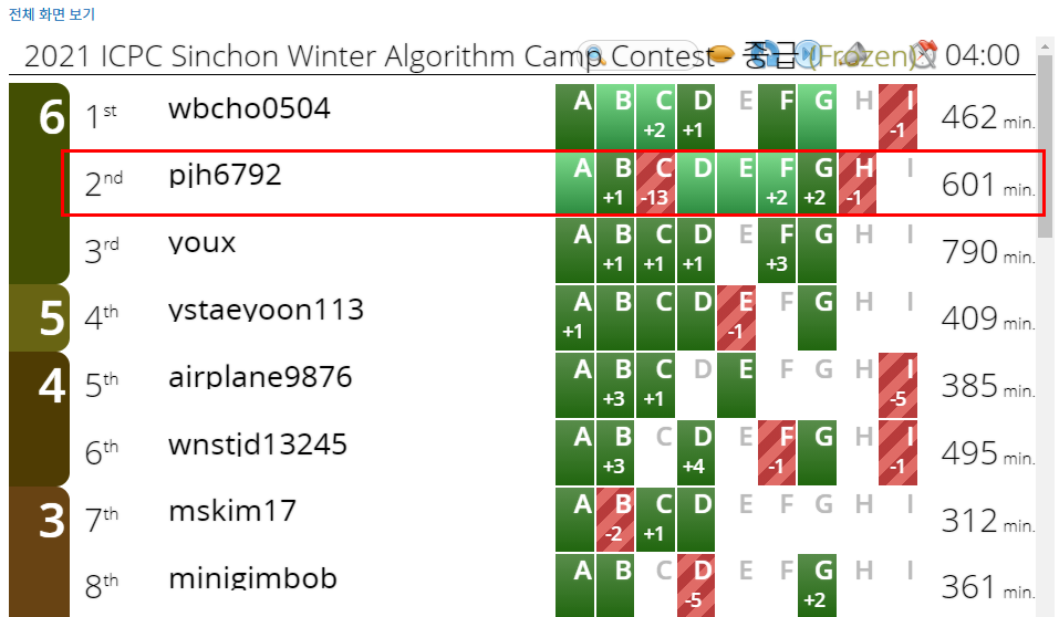 2시간 이후부터 스코어보드가 프리즈가 되었는데, 이 시점에서 6 솔브로 추정되는 사람들은 아무도 없어서 1등이 되었다.