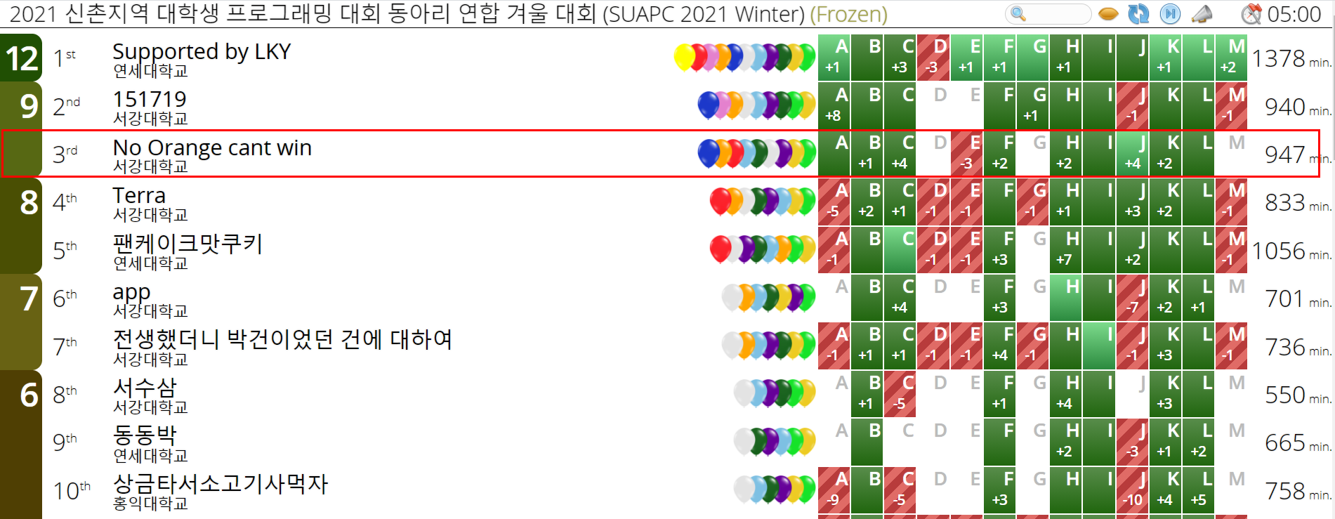 2021 신촌지역 대학생 프로그래밍 대회 동아리 연합 겨울 대회 (SUAPC 2021 Winter)에 참가하였다.