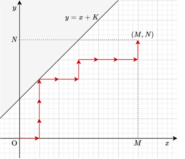 위의 그림에서 (0, 0)에서 (M, N)으로 이동하는 과정에서 한번이라도 y = x + K 직선 위로 올라가는 경우는 조건을 만족하지 않는 경우이다. y > x + K 즉, w > b + K인 경우이기 때문이다.