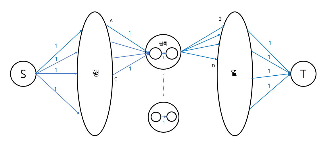 그다음, 각 행에서 모든 열로 용량이 1인 간선을 연결해주고, 각 열 별로 싱크(T)로 용량이 1인 간선을 연결해주면, 같은 열에 2개 이상 들어갈 수 없으면서 행과 열을 연결하면 블록이 들어갈 위치가 정해지게 된다.