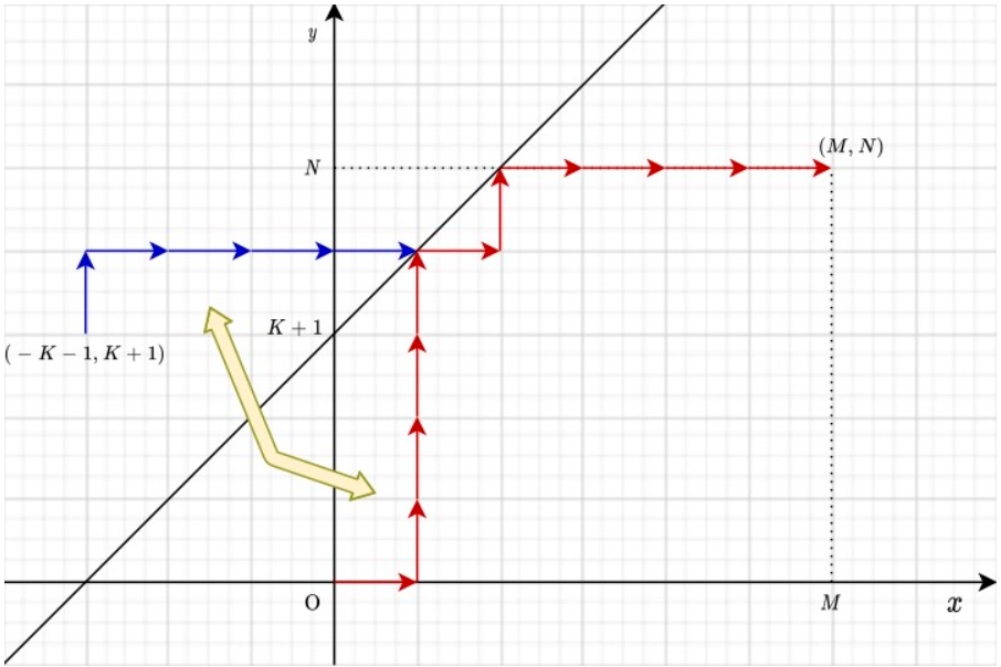 위 그림과 같이 (0, 0)을 y = x + K+1에 대해 점대칭을 시킨 (-K-1, K+1)를 생각해보자. (-K-1, K+1)에서 (M, N)으로 가는 경로는 반드시 y = x + K+1와 만나게 되며, 그 교점을 P라고 하면 (0, 0) ~ P의 경우의 수와 (-K-1, K+1) ~ P의 경우의 수가 동일하다.