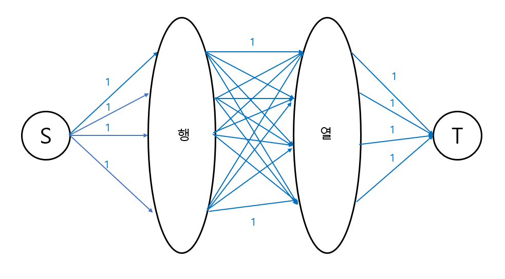 같은 행에 2개 이상 놓을 수 없으므로, 소스(S)에서 각 행별로 용량이 1인 간선을 연결해주면 같은 행에 2개 이상 들어가지 않는다.