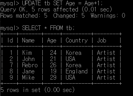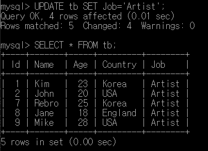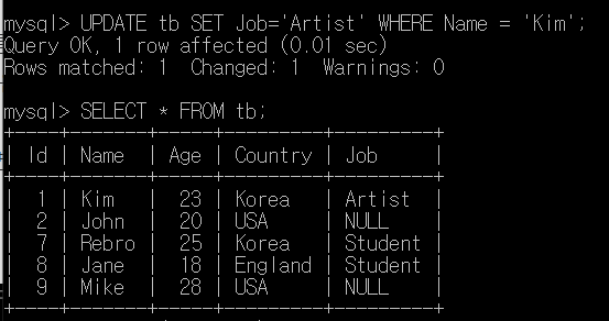 mysql> UPDATE tb SET Job='Artist' WHERE Name = 'Kim';