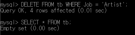 모든 행의 Job이 Artist이므로 테이블 전체가 삭제되는 것을 알 수 있다. 이때, 테이블 자체는 삭제되지 않는다.