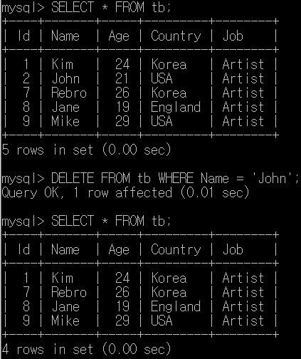 mysql> DELETE FROM tb WHERE Name = 'John';