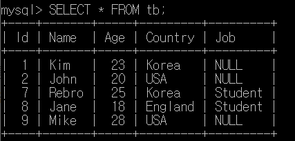 mysql> UPDATE tb SET Job='Artist' WHERE Name = 'Kim';