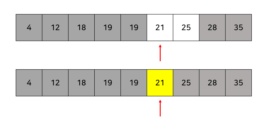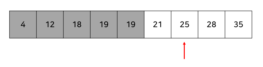 그다음 또 가능한 범위에서 중간지점을 확인해보자. 25는 20세 이상이므로 답이 될 수도 있다. 하지만 25보다 왼쪽에 있으면서 살아있는 값이 존재하기 때문에, 이 값들도 답이 될 가능성이 있으므로 확인해주어야 한다.