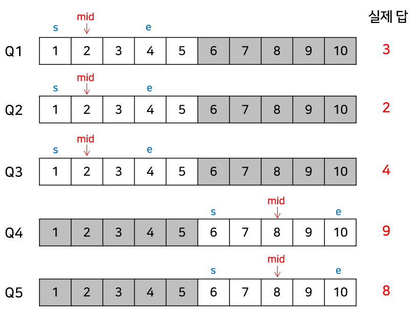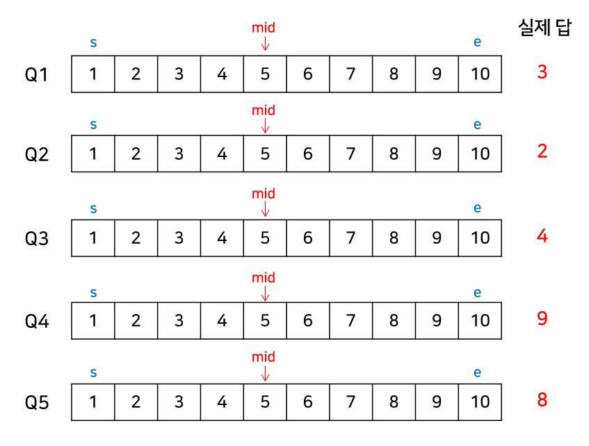핵심적인 아이디어는 각 쿼리마다 동일한 이분 탐색을 계속 수행한다는 것에서 얻을 수 있다. 따라서 이분 탐색을 수행할 때 현재의 mid, 즉 k값이 다른 쿼리에서의 k값과 일치하는 경우가 발생할 수 있다.