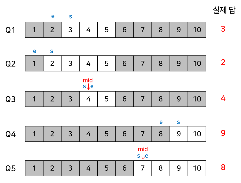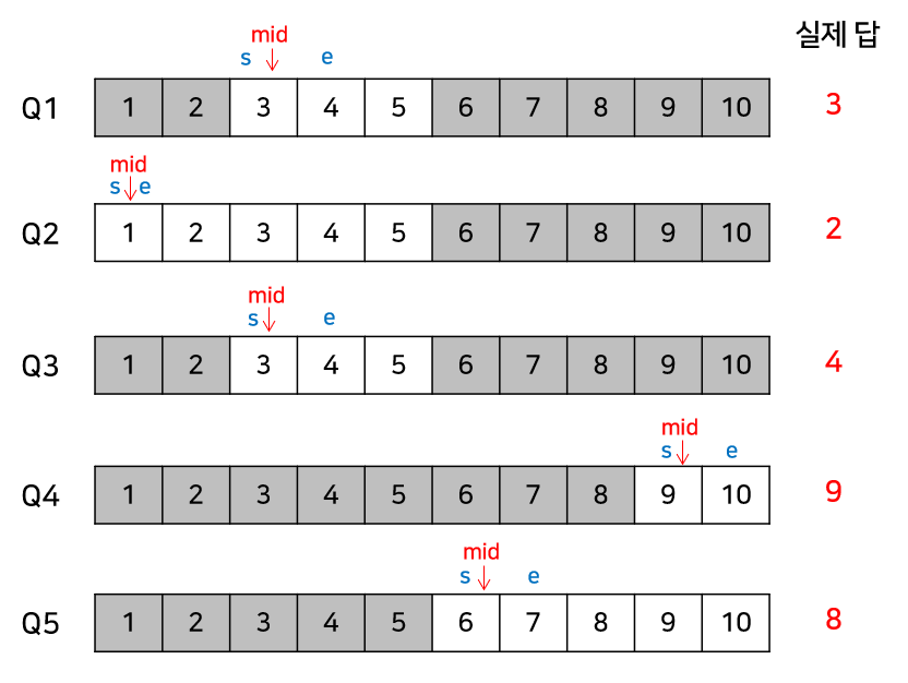코드로 구현할 땐, |e - s| 만큼의 2차원 벡터를 선언하여, 각 쿼리마다 현재 mid값인 인덱스에 쿼리의 번호를 넣어주어, 동일한 mid값에 대해서 쿼리들을 동시에 처리하게 해준다.