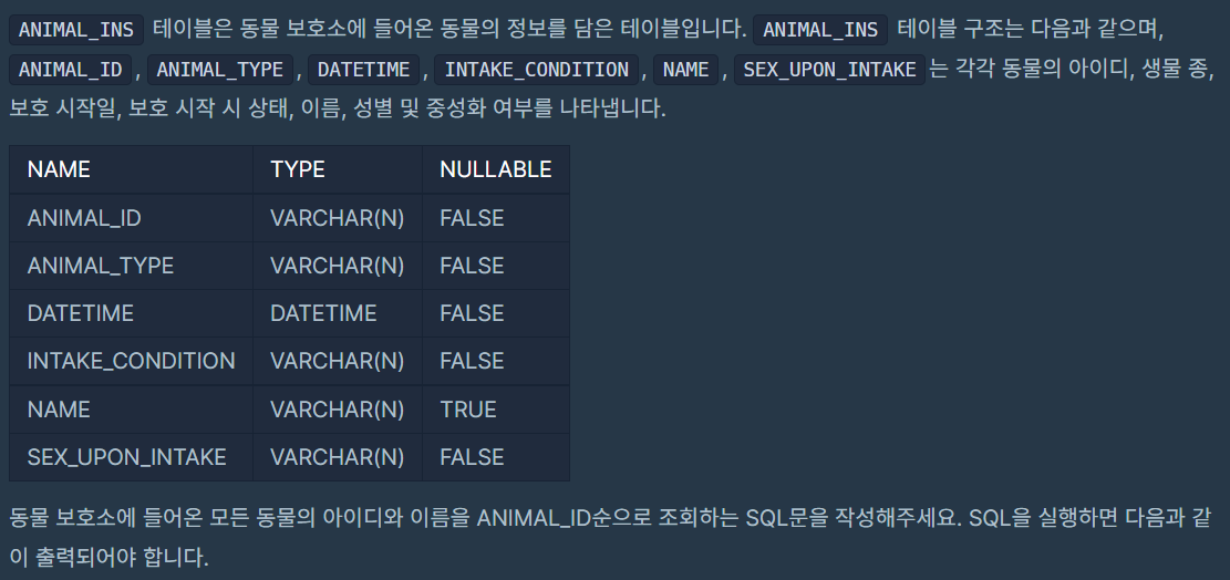 따라서 보호소에 들어온 순서대로 정렬을 한 뒤, LIMIT 1로 1개만 출력하게 되면 가장 먼저 들어온 동물을 조회하게 된다.
