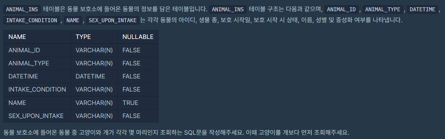 고양이와 개의 마리수를 각각 계산하기 위해선 GROUP BY를 통해서 그룹으로 묶어주면 된다.