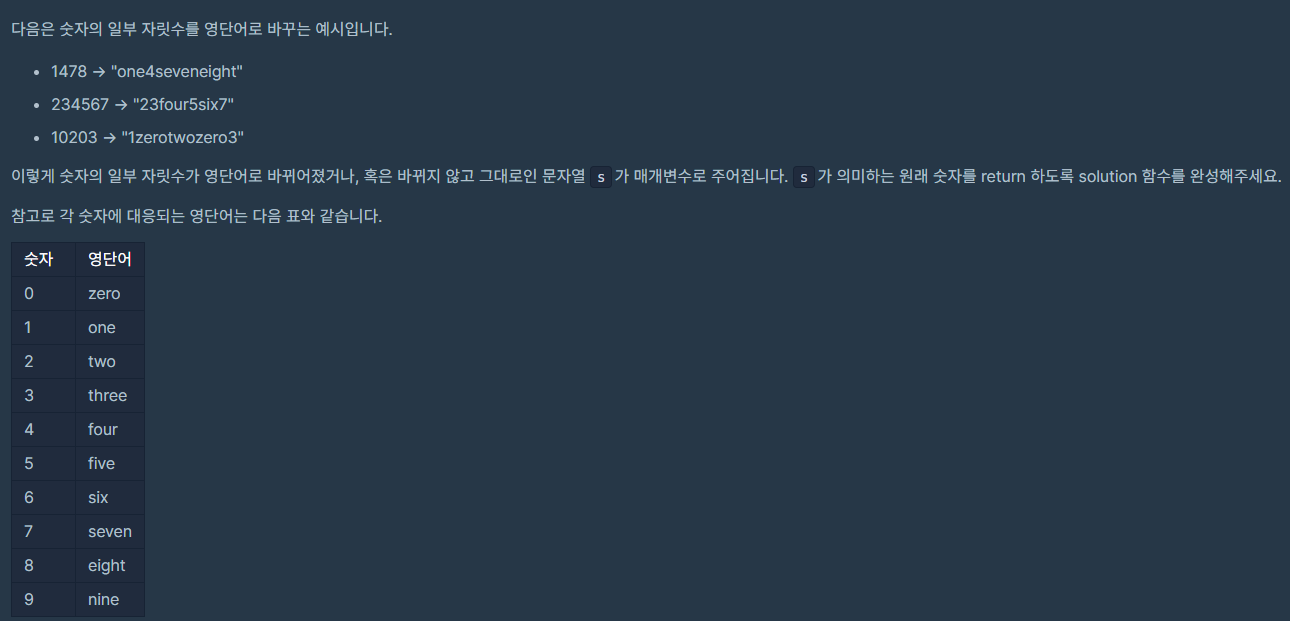숫자를 기준으로 문자열을 나눈 다음, 미리 map에 저장해둔 [단어 : 숫자] 쌍을 이용하여 숫자로 바꾸어준다.