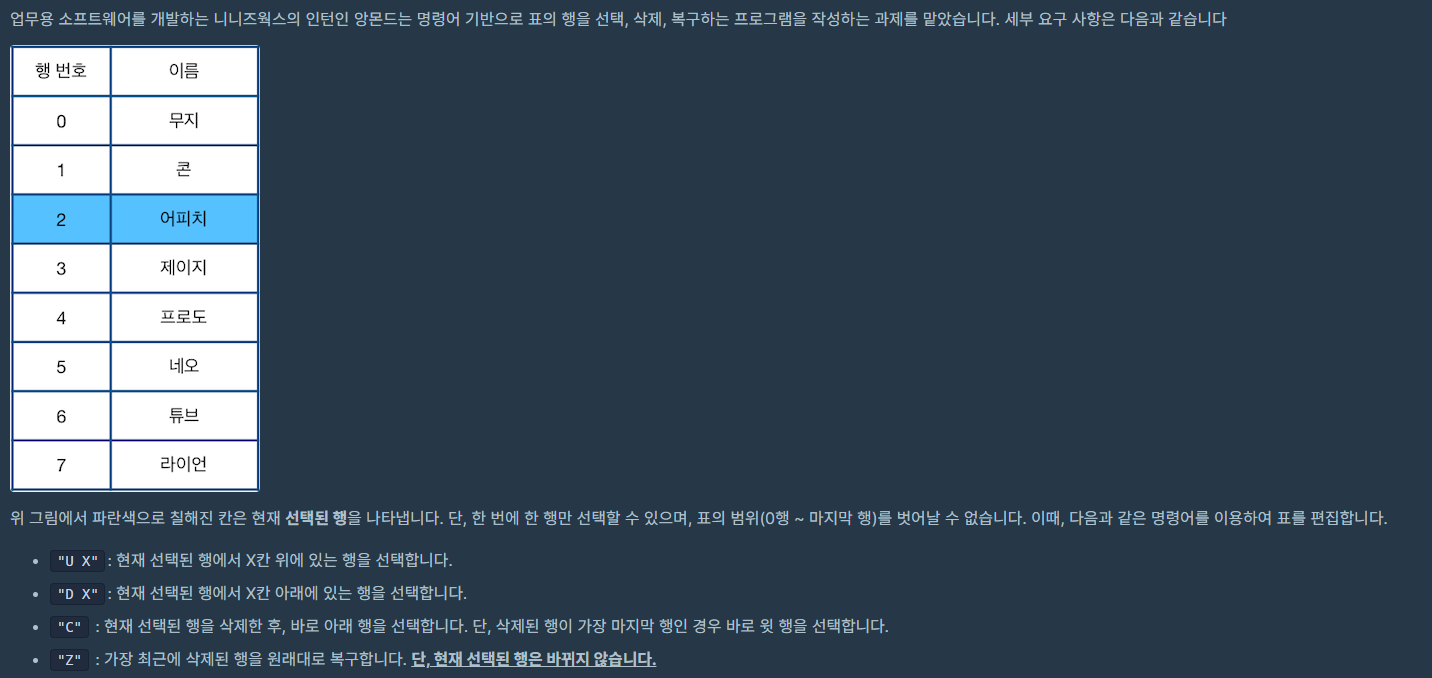 'C'이면 현재 원소를 삭제하는 경우인데, 현재 원소가 마지막 원소라면 앞의 원소로 이동하고, 그렇지 않으면 뒤의 원소로 이동한 후 이전에 가리키던 원소를 삭제한다.