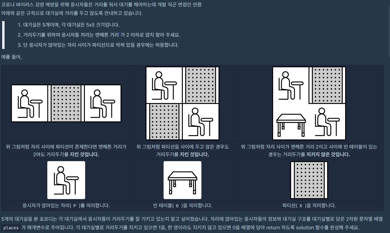 대기실의 크기가 5x5로 매우 작다. 따라서 BFS가 아닌 DFS를 이용해도 시간에 큰 영향은 없다.