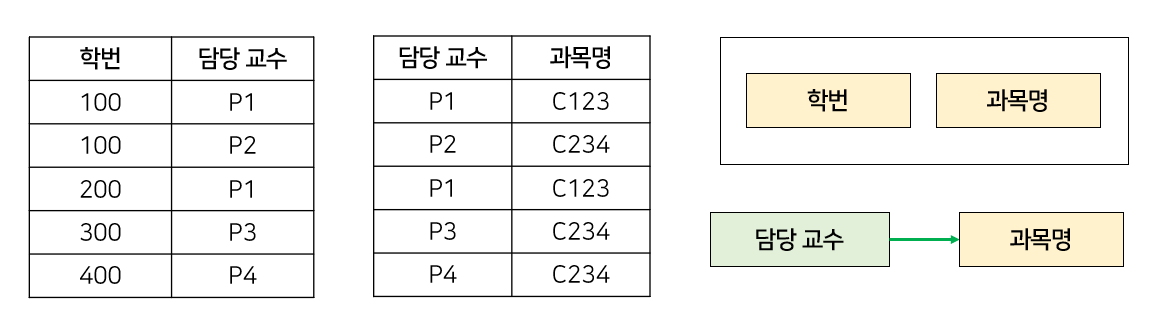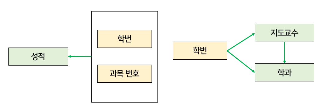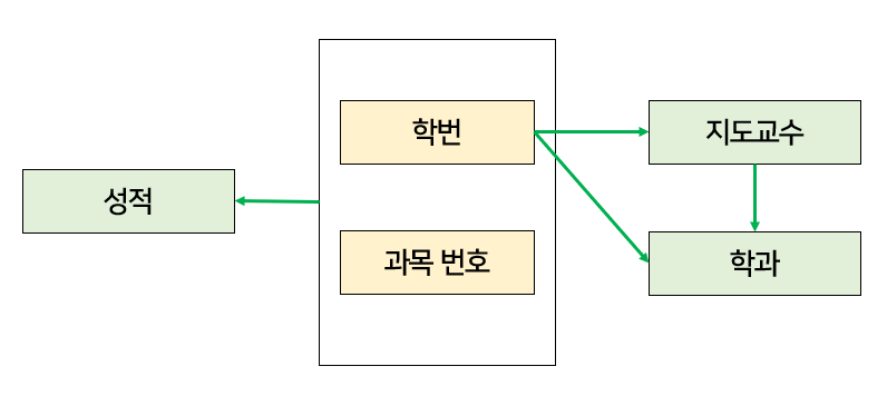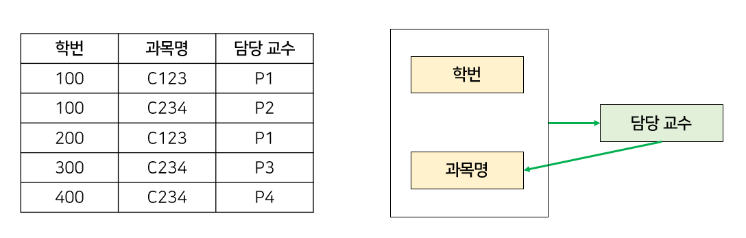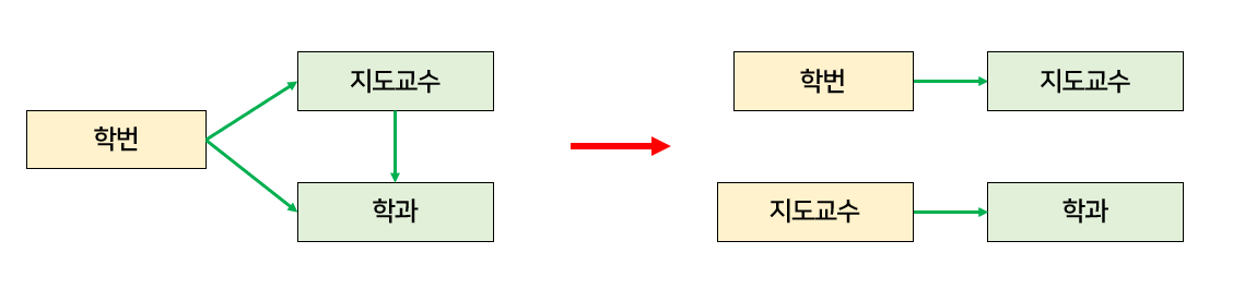 위 예시에서는 학번 → 지도교수, 지도교수 → 학과, 학번 → 학과의 관계가 존재한다.