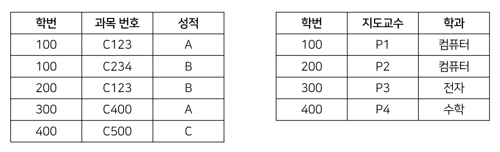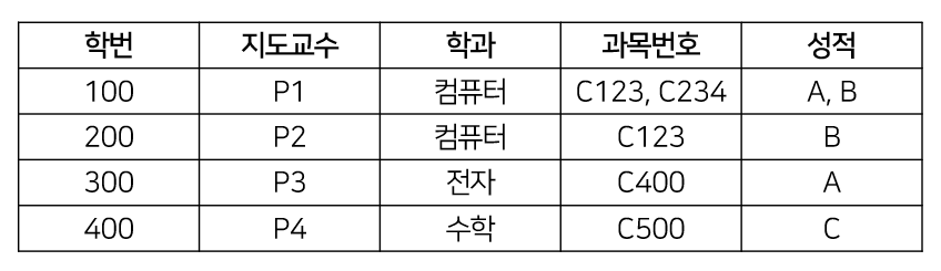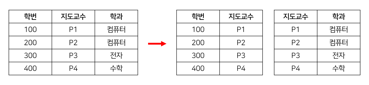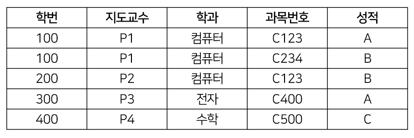 - 갱신 이상 : 100번 학생이 지도교수를 변경할 때, P1인 행을 모두 찾아서 변경해주어야 한다.