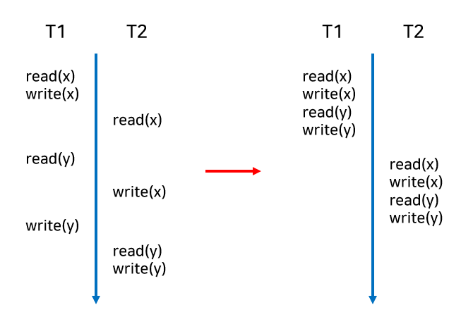 - 직렬(Serial) 스케줄 : 트랜잭션 별로 연산을 순차적으로 수행하는 것