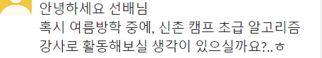 메시지를 받자마자 많은 생각이 들었는데, 우선 메시지가 왔다는 건 강사진 인력이 부족하거나 모집에 어려움이 있다는 뜻이라고 생각했다. 강의를 할 만한 사람들이 꽤 있다고 생각했는데 조금 놀랐다.