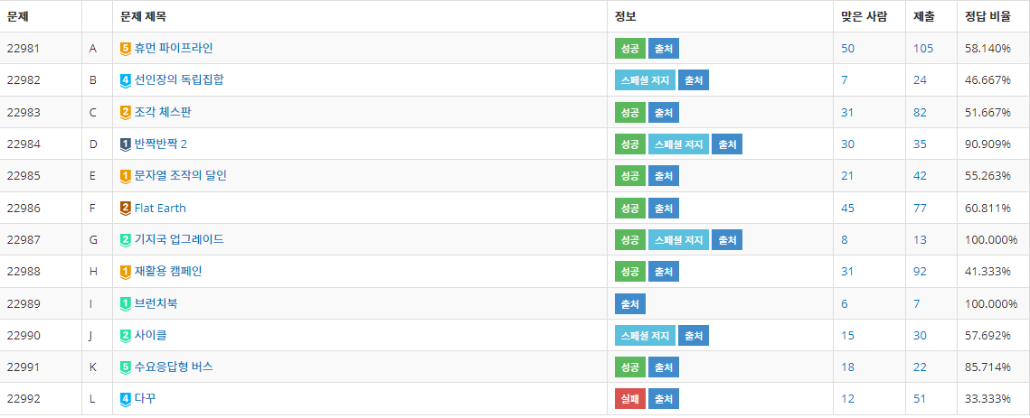 C와 비슷한 유형의 2차원 dp문제가 되게 많아서 무난하게 해결했던 것 같다. 사실 초반 20분 정도는 순위에서 많이 밀려있어 조급했는데 4 솔을 한 이 시점부터 상위권으로 올라와서 조금 안도했다.