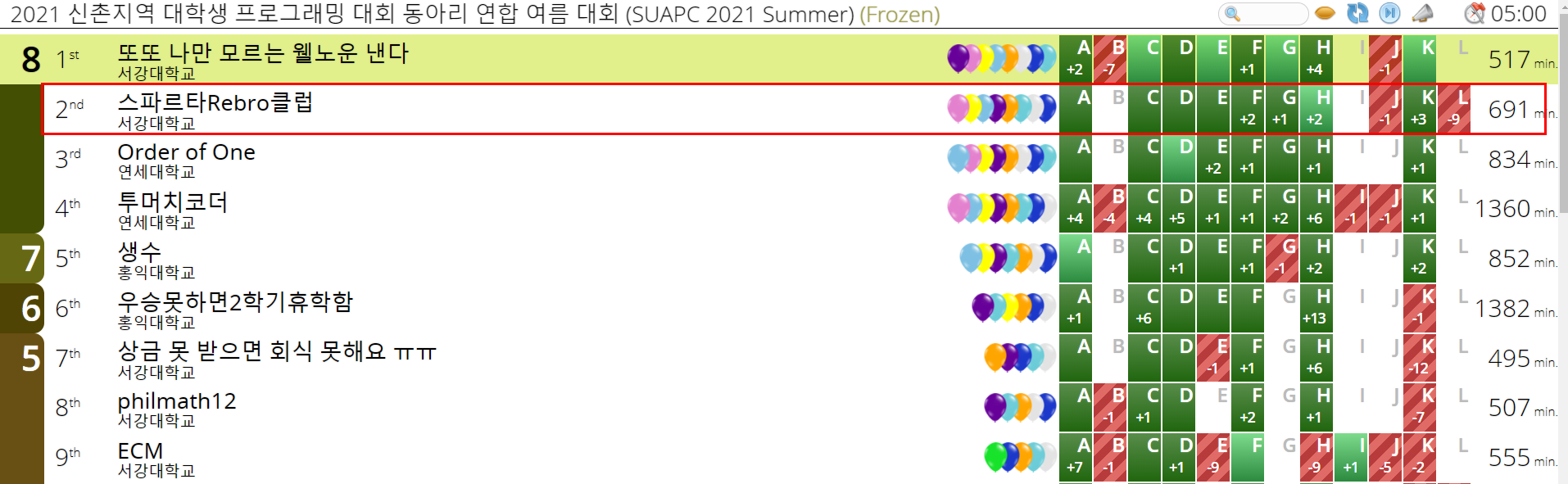 또 대회 땐 스코어보드를 따라가자고 했다. 풀리는 문제들만 잘 따라가도 적어도 5등은 할 수 있다고 생각했는데, 결과적으로 잘 따라가서 2등을 차지할 수 있었다. 퍼솔이 1개밖에 없음에도 불구하고 페널티가 꽤 작다.