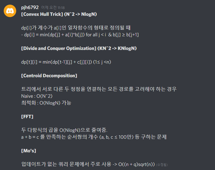 정리해준 이유는, 애초에 팀원들이 이런 알고리즘의 존재를 모르기 때문에 자신이 구한 풀이의 시간 복잡도가 크게 나와 불가능하다고 판단할 수 있기 때문이었다. 따라서 혹시 풀이를 떠올렸을 때 위와 같은 형태가 나온다면 나에게 풀이를 던져주고 내가 구현을 하는 방식으로 진행을 하려고 약간의 벼락치기를 했다. (결국 대회에 나오지는 않았다....)