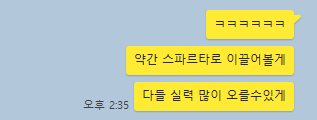 팀명은 whitehorse의 추천으로 지어졌는데, 사실 난 스파르타코딩클럽이란게 있는 줄 몰랐다. 팀명을 정할 때쯤 내가 팀원들에게 문제 열심히 풀라는 약간의 압박을 넣고 있었는데 그걸 본 팀원이 갑자기 팀명을 떠올렸다.