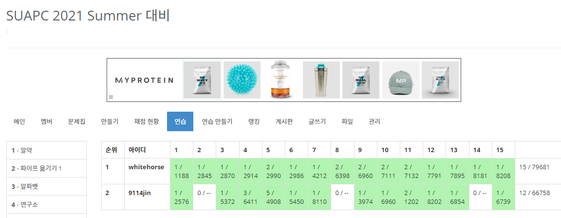 2021 신촌지역 대학생 프로그래밍 대회 동아리 연합 여름 대회인 [SUAPC 2021 Summer]에 재석이와 상우형과 함께 "스파르타Rebro클럽"이라는 팀명으로 참가하였다. (나 : Rebro / 재석 : whitehorse / 상우형 : 9114jin)