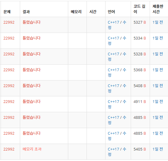 겨우겨우 예제가 잘 나오게 코드를 짠 뒤 제출했는데 곧바로 틀렸다. 그 뒤부턴 수많은 반례들이 나왔다. 너무 긴 코드를 짜느라 구현에서 많은 실수가 있었고, 생각하지 못한 예외 케이스들을 찾아내서 추가로 구현하고 또 거기서도 실수를 하고.... 종료 시간이 점점 다가와 많이 급해졌다.