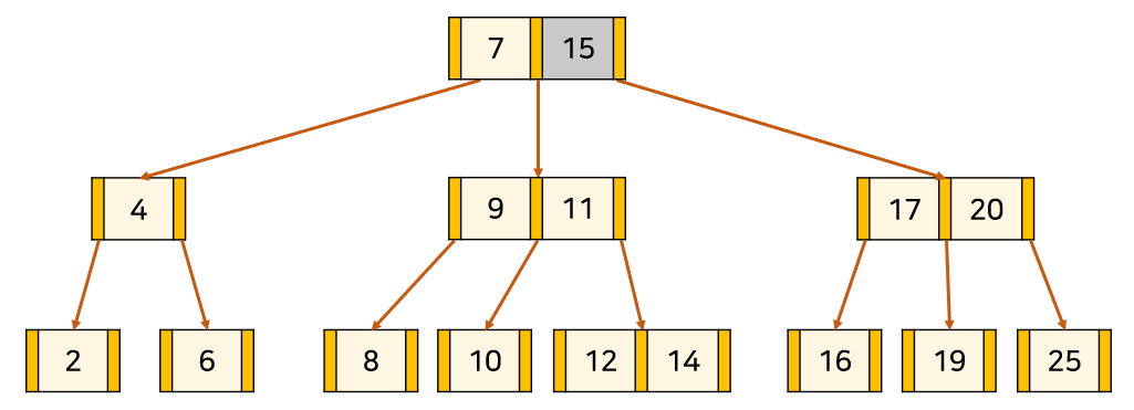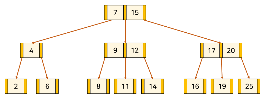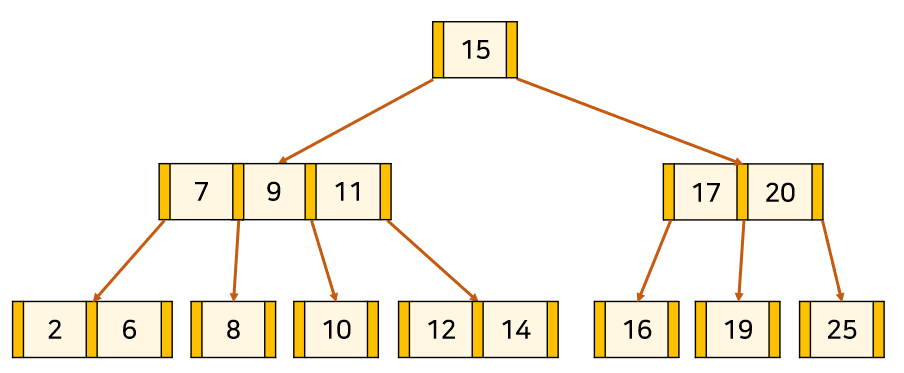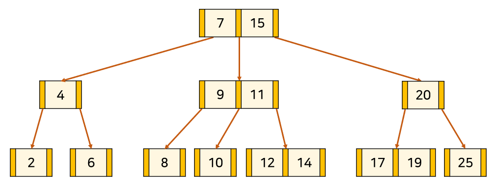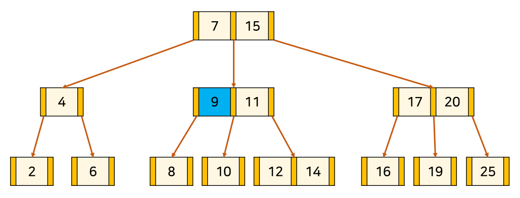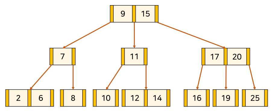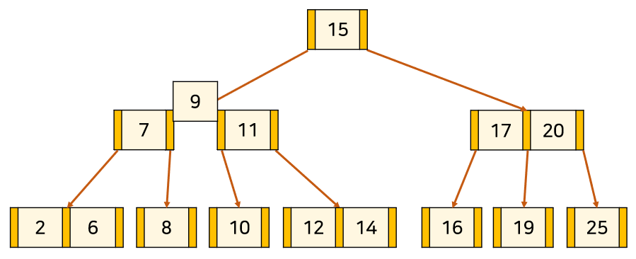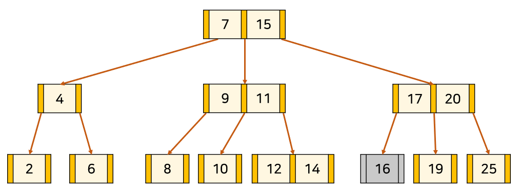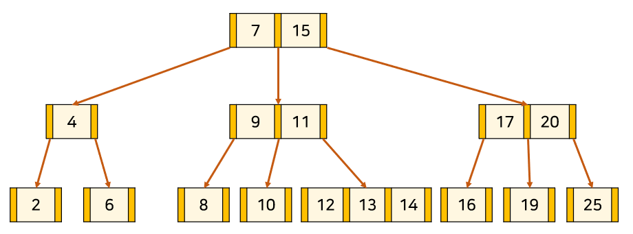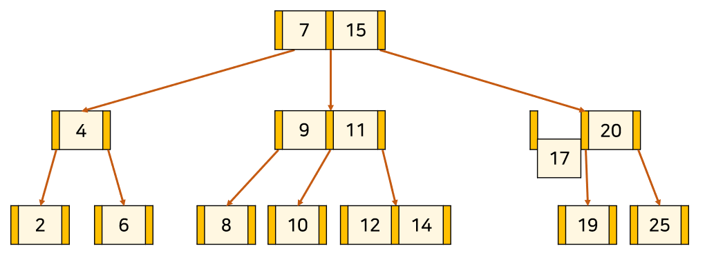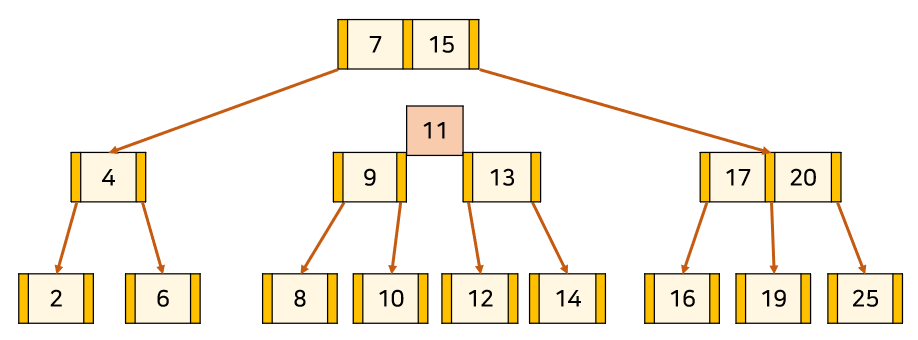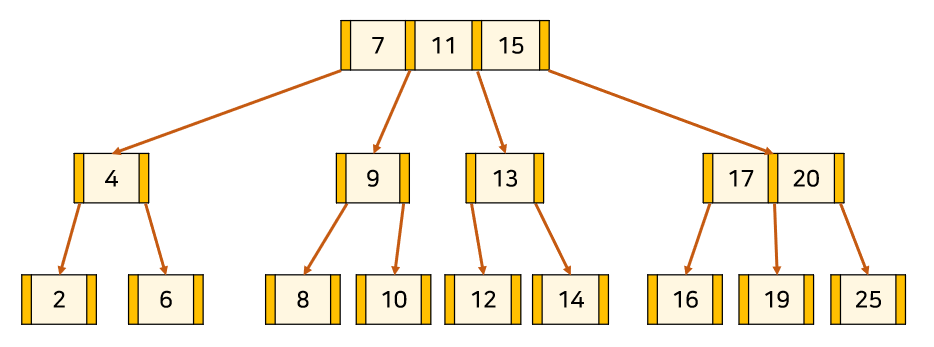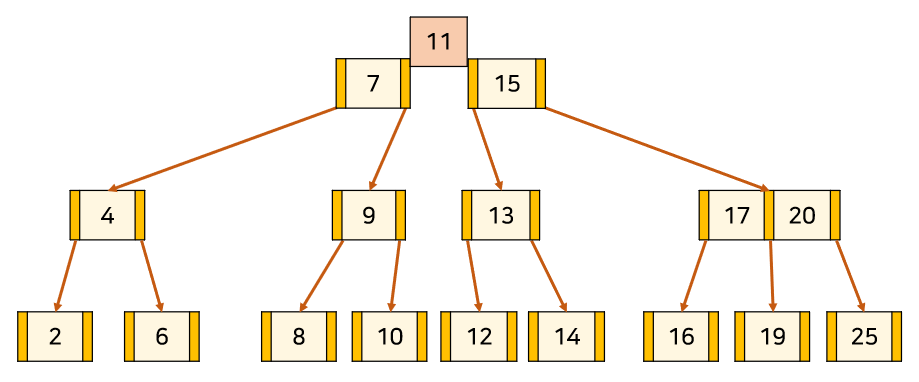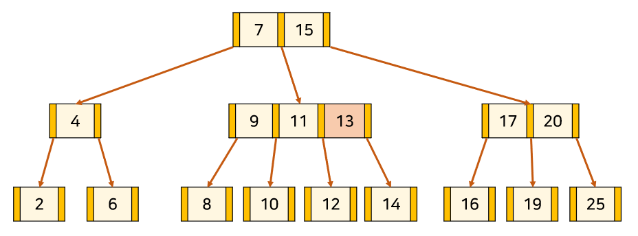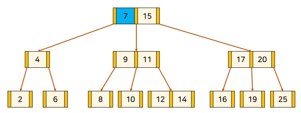 위의 트리는 3차 B-Tree의 예시이다. 주황색 부분은 '자식 node를 가리키는 포인터'이고, 살구색 부분은 '각 node의 key'이다. key와 데이터가 1대1 대응하고 있다.