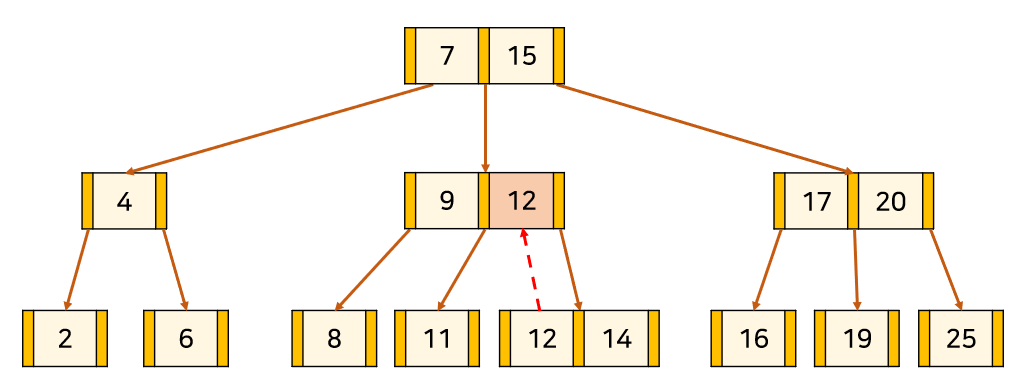 3) k가 존재하지 않는다면, 어떤 이웃한 두 key 사이에 K가 들어가는 경우 사이의 포인터를 통해 자식 node로 내려간다.
