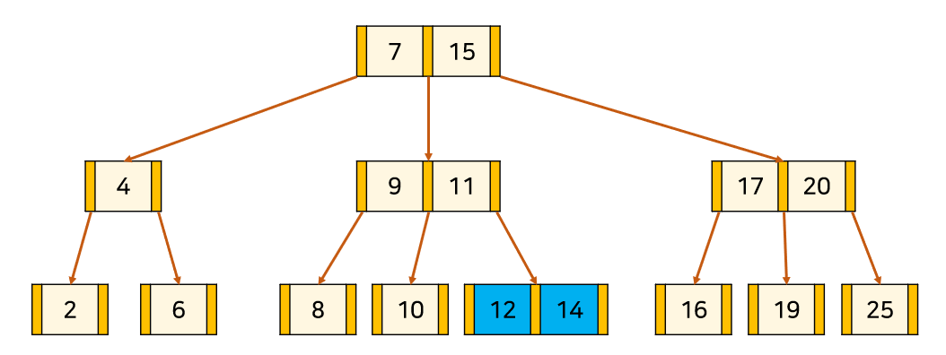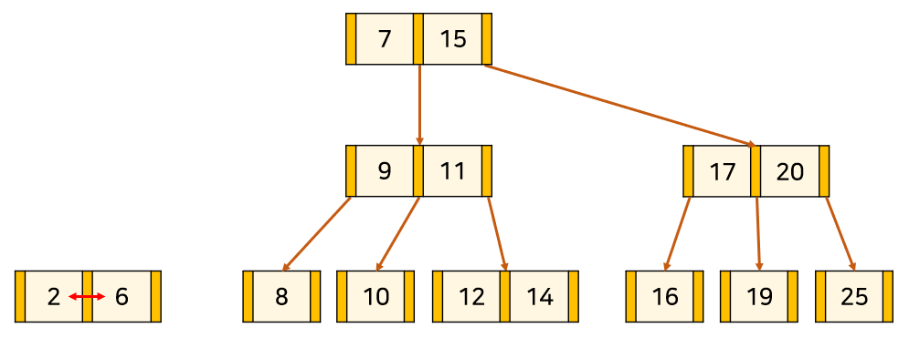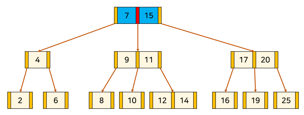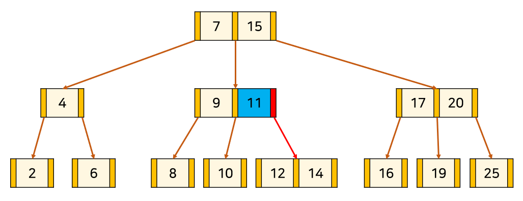 node 안에서 key들은 항상 정렬된 상태를 유지하며, 이진 탐색 트리처럼 항상 각 key의 왼쪽 자식은 자신보다 작고, 오른쪽 자식은 자신보다 크다.