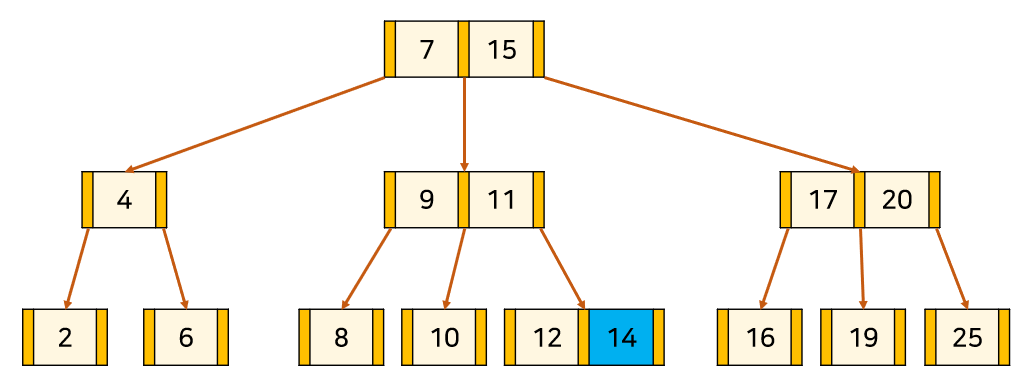 예를 들어 위의 B-Tree 예시에서 14라는 key를 검색한다고 가정해보자. 아래와 같이 진행된다.