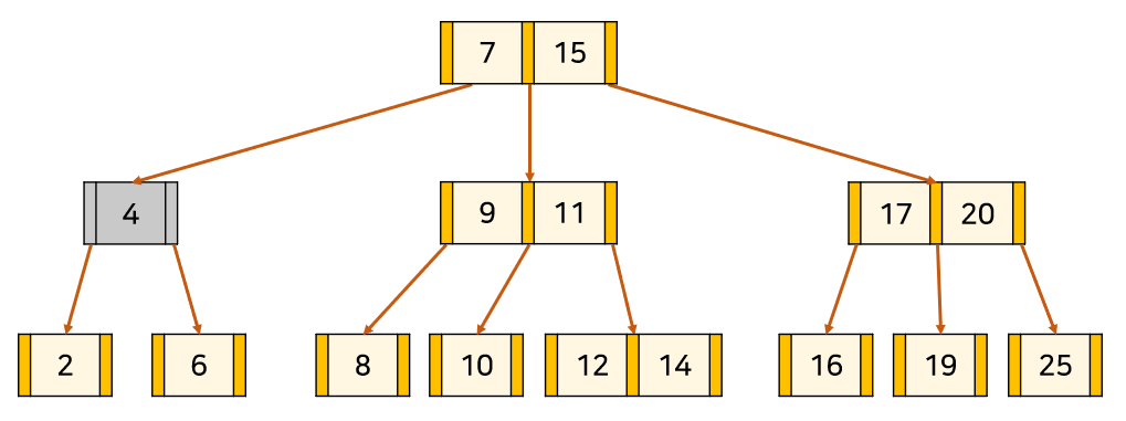 삭제되는 key가 어느 node에 속해있는지, node의 상태는 어떤지에 따라 삭제되는 방식이 조금씩 다르다. 경우는 다음과 같이 나눠진다.