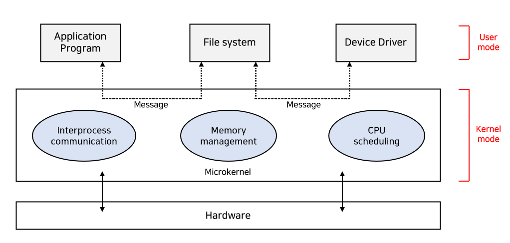 이렇게 운영체제를 세분화해 계층을 분리한 것을 계층적 접근(Layered approach) 방식이라고 한다. 이 방식은 유지보수가 아주 편하고, 하나의 계층에만 신경 쓰면 다른 계층에는 아무런 신경을 쓰지 않아도 된다.