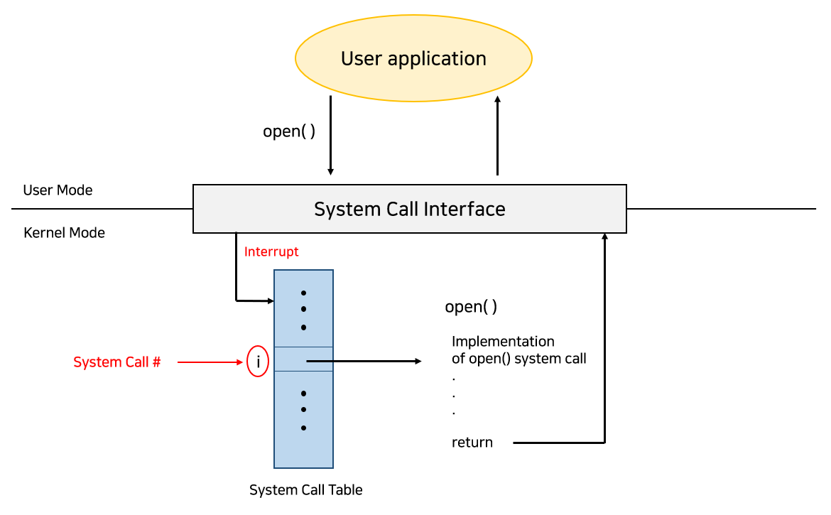 각각의 시스템 콜은 숫자로 구별된다. 시스템 콜 인터페이스(System Call Interface)가 이 숫자에 따라 매핑된 테이블을 유지한다. 시스템 콜 테이블(System Call Table)은 메모리 주소의 모음인데, 해당 메모리 주소는 인터럽트 서비스 루틴을 가리키고 있다.