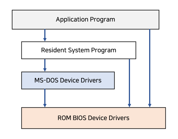 MS-DOS에서는 몇몇 구조를 가지고 있긴 했지만, 사실상 인터페이스나 계층이 잘 구분되지는 않았다. MS-DOS는 사용자 프로그램이 입출력 루틴에 접근해 디스플레이와 디스크 드라이브에 직접 쓰기를 할 수 있었다. 따라서 사용자 프로그램에 문제가 생기면 시스템 전체에 문제가 발생하였다. 이를 개선한 시스템이 UNIX 시스템이다.