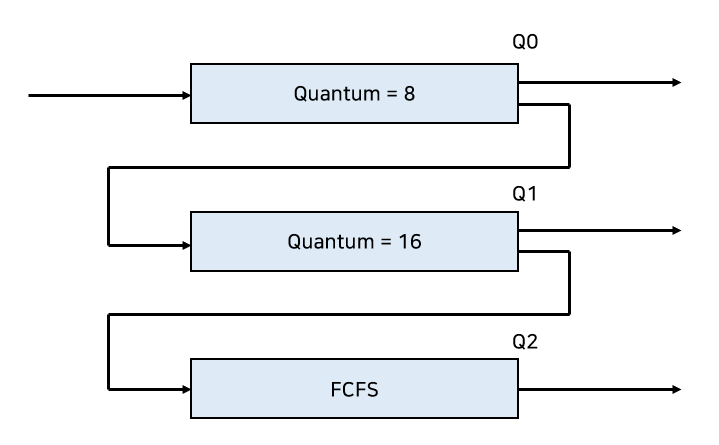 할당 시간이 8ms, 16ms인 RR 방식의 두 Queue와 FCFS 방식의 한 Queue가 있는 예를 들어보자.