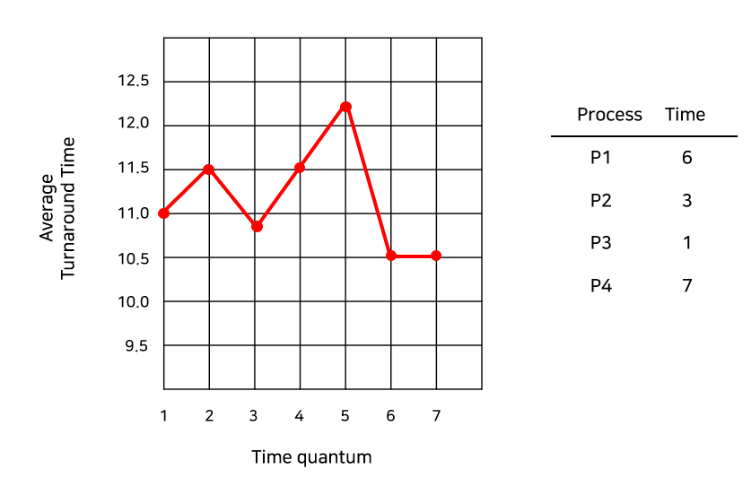 평균 소요 시간은 할당 시간이 커진다고 해서 반드시 증가하는 것은 아니다. 할당 시간 q가 클수록 FCFS의 방식과 유사하고, q가 작을수록 Context switch의 오버헤드가 커지기 때문에 적절한 할당 시간을 배정하는 것이 중요하다.