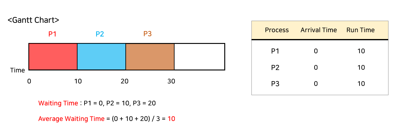 각 작업이 종료될 때까지 CPU를 빼앗지 않으므로 Non-Premptive 방식이며, FIFO 방식의 큐(Queue)와 동일하다.
