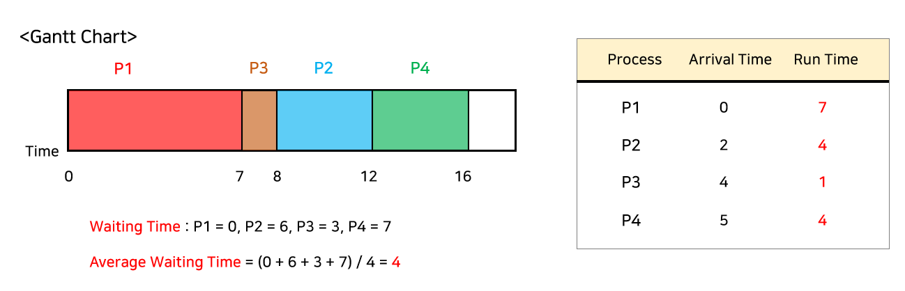 프로세스들이 모두 다른 시간에 도착한다고 가정하자. 현재 도착한 프로세스 중 시간이 가장 짧은 프로세스에 CPU를 할당하고, 한번 실행을 시작하면 완료될 때까지 CPU를 빼앗기지 않는다면 위처럼 평균 대기 시간은 4가 된다.
