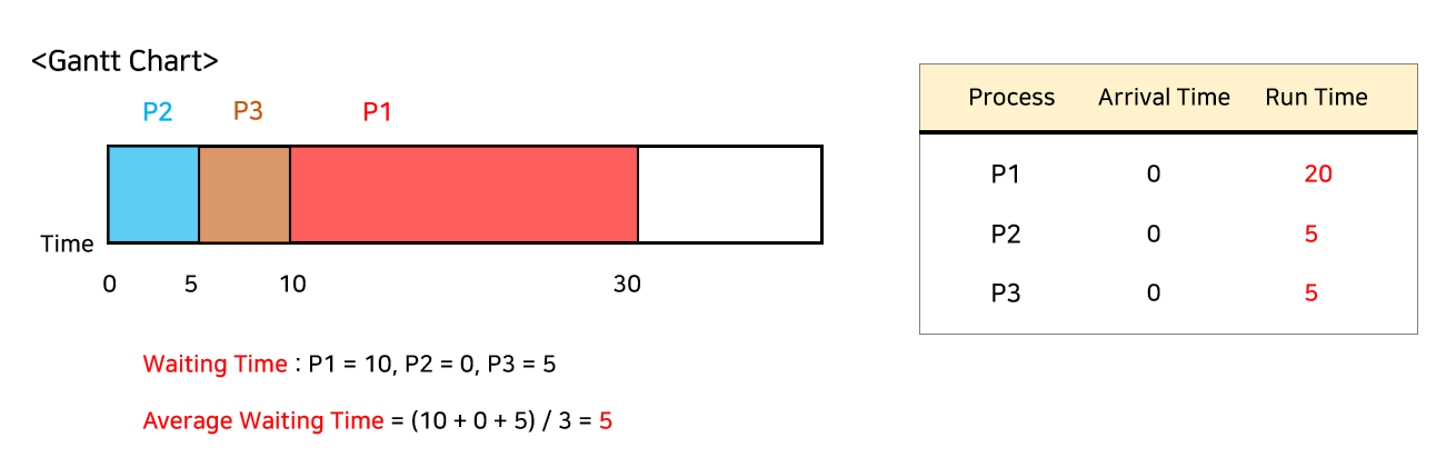 위와 같이 수행 시간이 짧은 작업인 P2와 P3을 먼저 수행하게 되면 평균 대기 시간은 5가 된다. 즉, FCFS 방식은 효율적인 방식이 아니다.