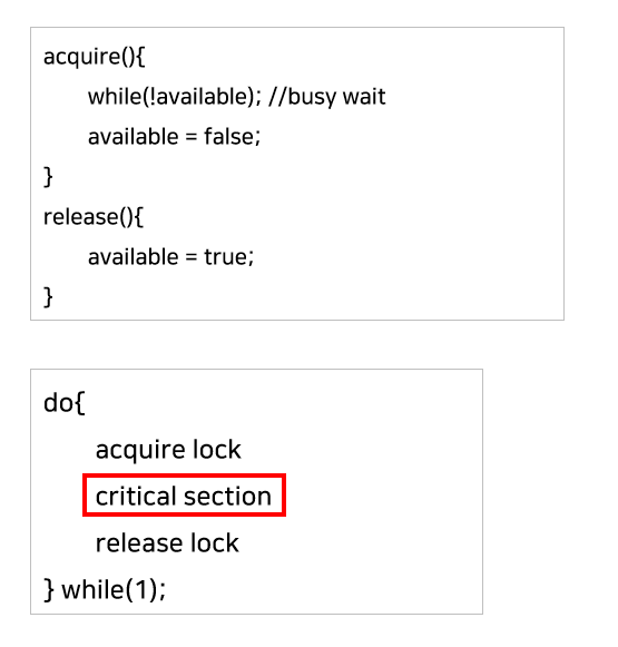하지만, Critical Section 진입을 기다리면서 계속 CPU와 메모리를 사용하는 Busy Waiting의 문제점이 있다.