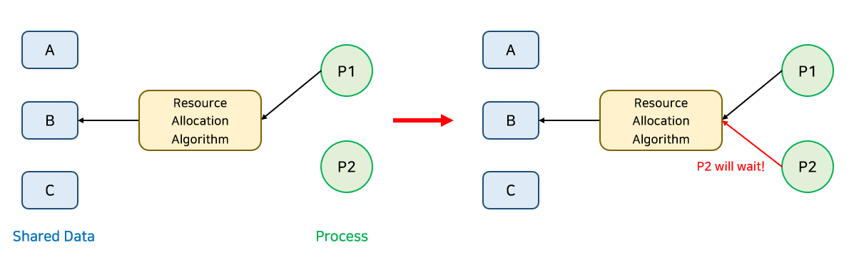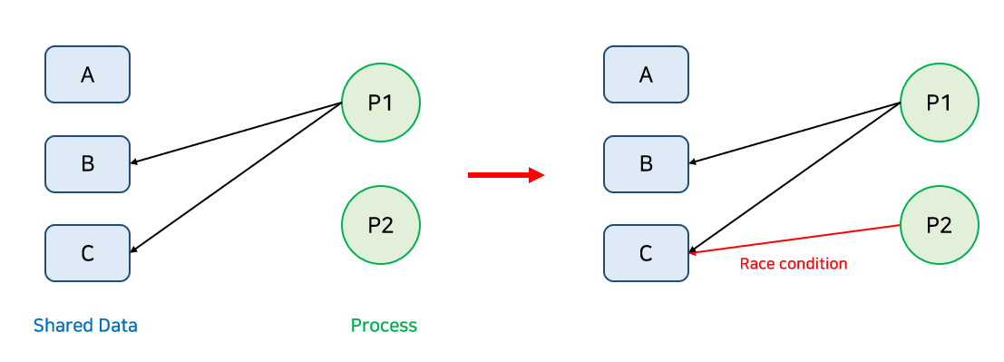 위 그림은 Race condition이 발생할 수 있는 경우의 예시이다. P1이 B와 C를 사용하고 있을 때 P2가 C에 접근한다면 Race condition이 발생할 수 있다.