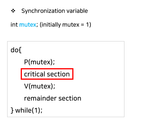 2. Binary Semaphore : 정수 값이 오직 0 또는 1이다. Mutex lock과 동일한 역할을 갖는다. (Mutex lock과의 차이점)