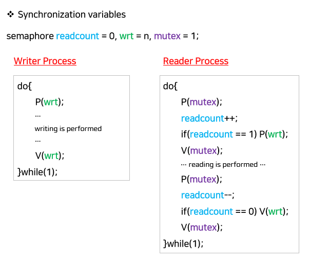 따라서 현재 수정하려고 하는 프로세스가 없다면 모든 대기 중인 Reader들의 접근을 허용하고, Writer는 대기 중인 Reader가 하나도 없는 경우 접근하도록 한다. 그리고 Writer가 접근 중이면 Reader들은 접근할 수 없도록 한다.