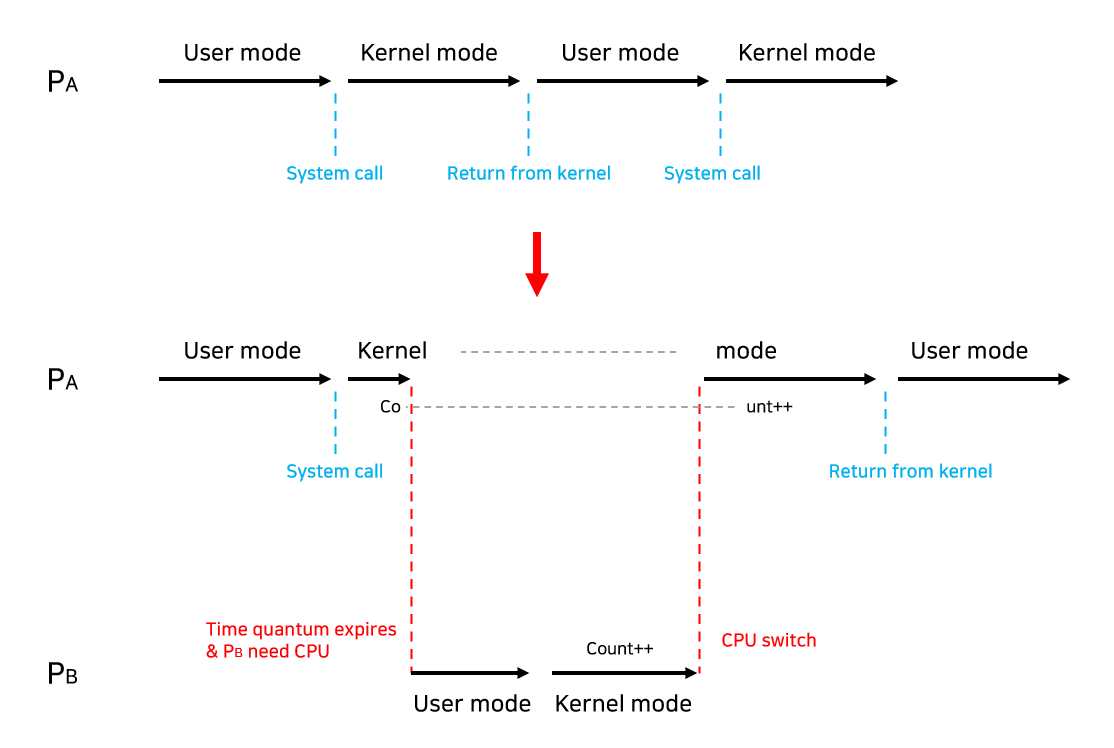 2. 프로세스가 시스템 콜을 호출해서 커널 모드로 수행 중인데 Context switch가 발생하는 경우