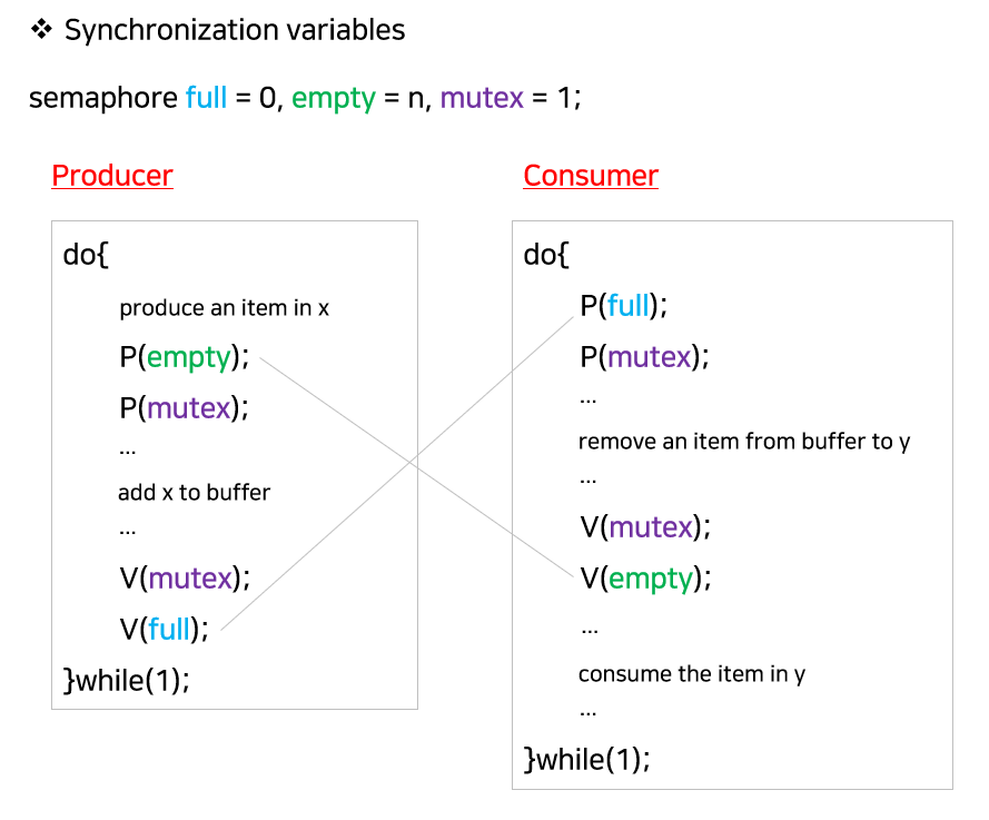 또, 버퍼가 꽉 찬 상태에서 생산자는 반드시 소비자가 버퍼의 데이터를 사용하기를 기다려야 하고, 버퍼가 빈 상태에서 소비자는 생산자가 버퍼를 채우기를 기다려야 한다.