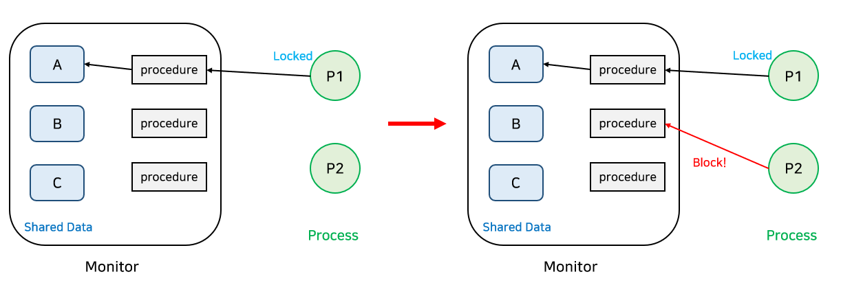 프로세스가 공유 데이터를 사용하기 위해서는 반드시 모니터 내의 Procedure를 통해야 한다. 그리고 동일한 시간엔 오직 한 프로세스나 스레드만 모니터에 들어갈 수 있다.