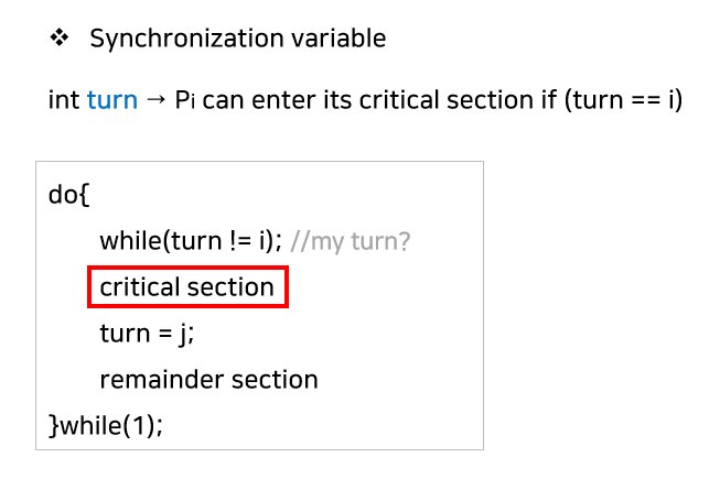 현재 Critical Section에 들어갈 프로세스가 어떤 프로세스인지를 한 변수로 나타내어 일치하는 프로세스만 진입하도록 하는 단순한 방식이다.