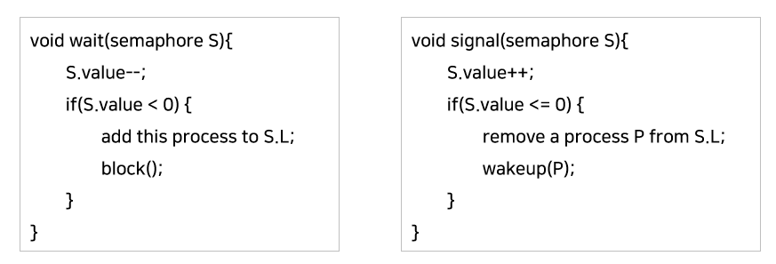 value는 세마포어 변수를 의미하고, L은 block 된 프로세스들이 기다리는 Queue다. 따라서 wait와 signal 함수도 아래와 같이 구현된다.
